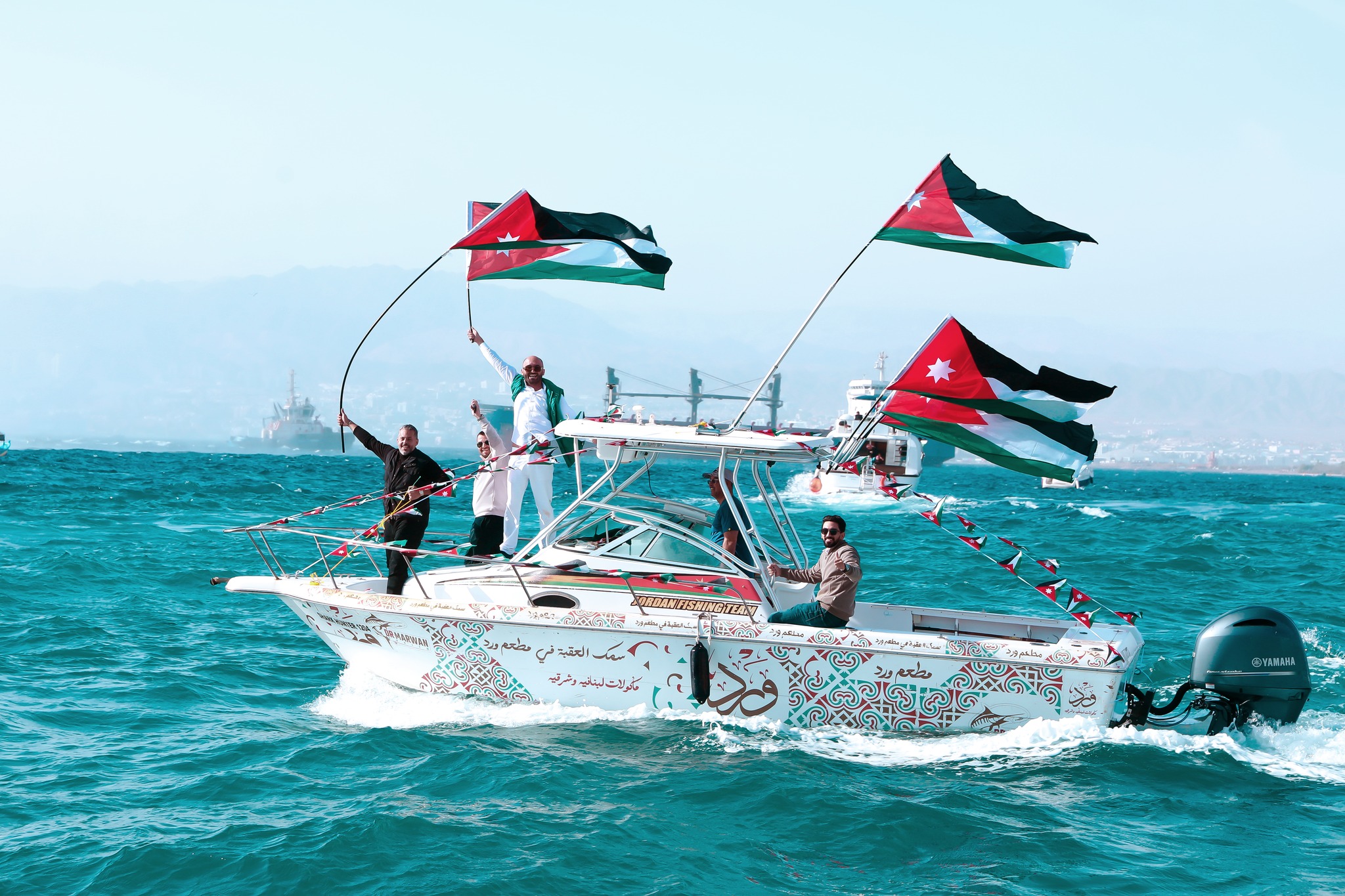 وتلتها قوارب الصيد والقوارب الزجاجية واليخوت السياحية والقاطرات البحرية التي تزيّنت بالأعلام الأردنية وصور جلالة الملك وسمو الأمير الحسين بن عبدالله الثاني، ولي العهد.